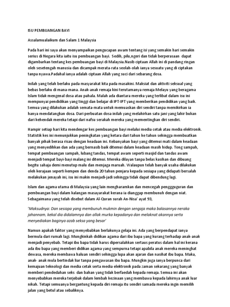 Isu pembuangan bayi di malaysia. Tidak sekadar berlaku di malaysia malah di merata tempat. Kemelut yang semakin serius ini bagaikan bangkai gajah yang tidak dapat ditutupi dengan nyiru lagi apabila akhbar akhbar perdana negara sering memaparkan kejadian ini dalam akhbar mereka dengan begitu meluas tanpa segan silu. Isu pembuangan bayi merupakan isu sejagat.