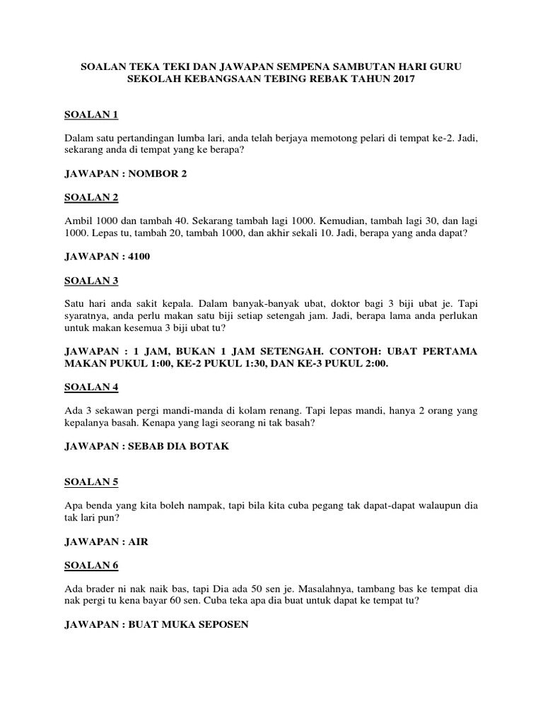 Soalan Teka Teki Dan Jawapan Sempena Sambutan Hari Guru Sekolah Tahun 2017